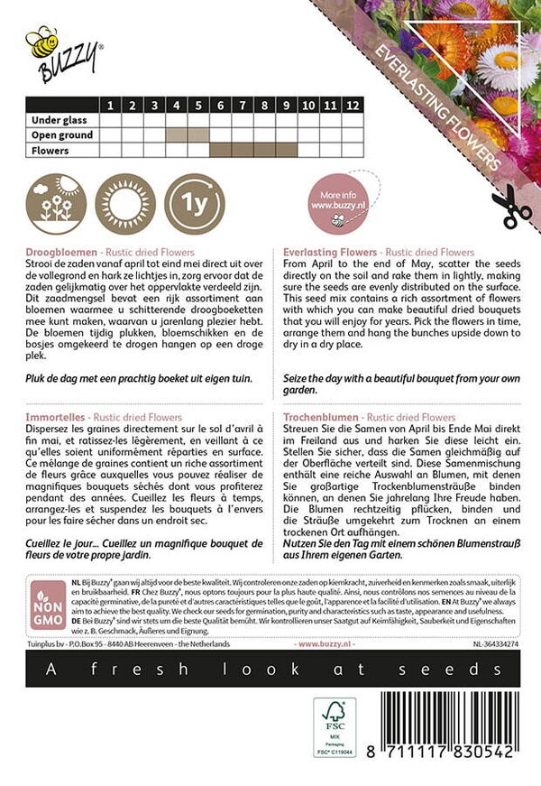 Strooi de zaden vanaf april tot eind mei direct uit over de vollegrond en hark ze lichtjes in, zorg ervoor dat de zaden gelijkmatig over het oppervlakte verdeeld zijn. Dit zaadmengsel bevat een rijk assortiment aan bloemen waarmee u schitterende droogboeketten kunt maken, waarvan u jarenlang plezier hebt. De bloemen tijdig plukken, bloemschikken en de bosjes omgekeerd te drogen hangen op een droge plek. Pluk de dag met een prachtig boeket uit eigen tuin.