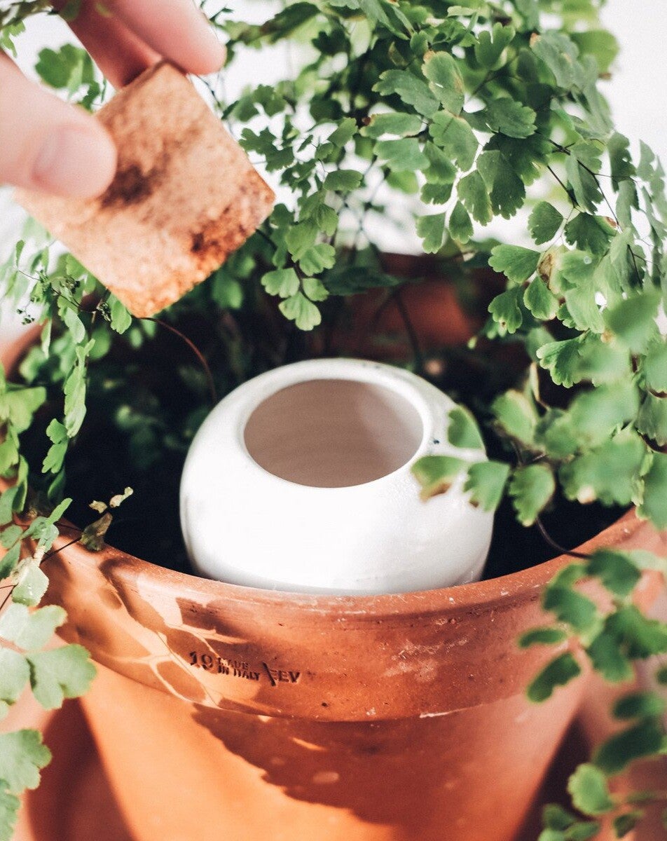 Het is een poreuze terracotta pot die je een plekje geeft tussen je planten en vult met water. Het vocht zal langzaam door de zijkanten naar buiten sijpelen waardoor je plant langdurig voorzien wordt van water.